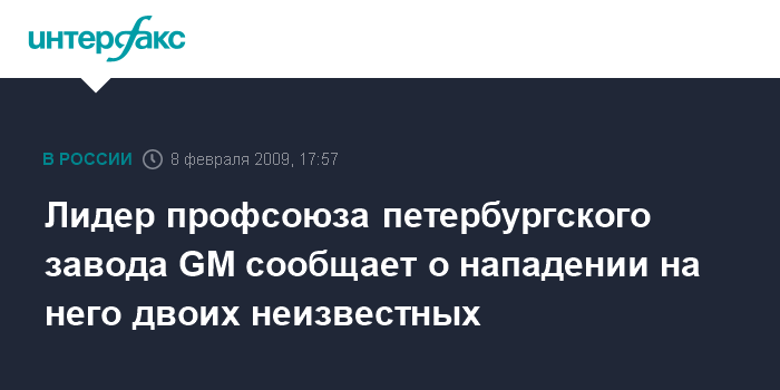 Санкт-Петербург. 8 февраля. INTERFAX.RU - Руководитель профсоюза завода "Дженерал Моторс" в Петербурге Евгений Иванов сообщил о нападении на него двоих неизвестных.