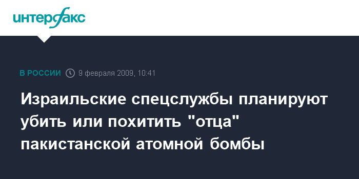 Москва. 9 февраля. INTERFAX.RU - Служба секретной разведки Израиля "Моссад" планирует похитить или убить пакистанского физика-ядерщика Абдул Кадир Хана и его коллег, сообщает иранский англоязычный телеканал "Пресс-ТВ".