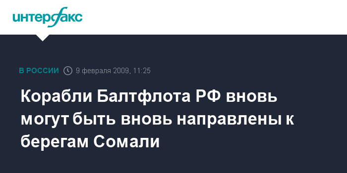 Москва. 9 февраля. INTERFAX.RU - ВМФ России может послать к берегам Сомали в 2009 году СКР "Hеустрашимый", а также новейший СКР "Ярослав Мудрый", строительство которого будет завершено весной нынешнего года, сообщил журналистам командующий Балтийским флотом вице-адмирал Виктор Мардусин.