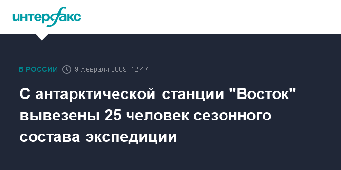 Москва. 9 февраля. INTERFAX.RU - С российской антарктической станции "Восток" в связи с окончанием работ вывезены 25 человек сезонного состава экспедиции и участников пришедшего со станции "Мирный" санно-гусеничного похода, сообщает пресс-служба Арктического и Антарктического института.