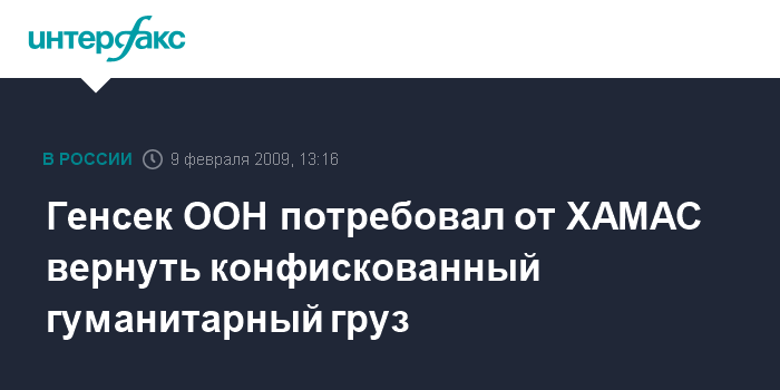 Москва. 9 февраля. INTERFAX.RU - Генеральный секретарь ООН Пан Ги Мун потребовал от радикального палестинского движении ХАМАС немедленно вернуть гуманитарный груз Ближневосточного агентства ООН для помощи палестинским беженцам, конфискованный в секторе Газа.