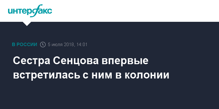 Москва. 5 июля. INTERFAX.RU - Двоюродная сестра осужденного в РФ и объявившего голодовку украинского режиссера Олега Сенцова Наталия Каплан встретилась с ним в колонии "Белый медведь" в Ямало-Ненецком автономном округе, сообщает украинское издание "Громадське" со ссылкой на саму Каплан.