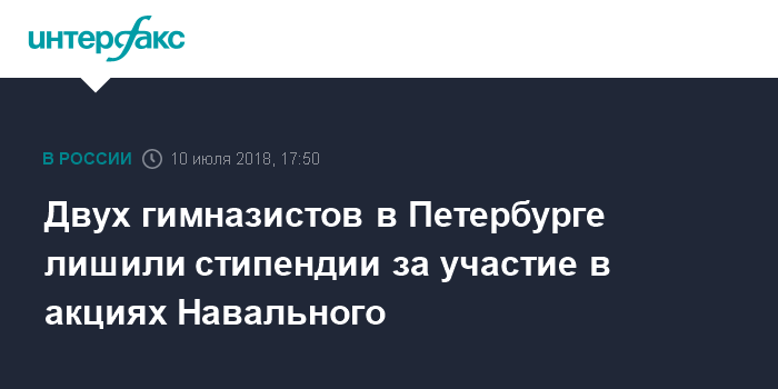 Москва. 10 июля. INTERFAX.RU - Двое выпускников Второй Санкт-Петербургской гимназии были лишены стипендии по итогам года, поскольку состояли на учете в полиции после участия в акциях оппозиционера Алексея Навального, сообщили "Интерфаксу" в приемной образовательного учреждения во вторник.