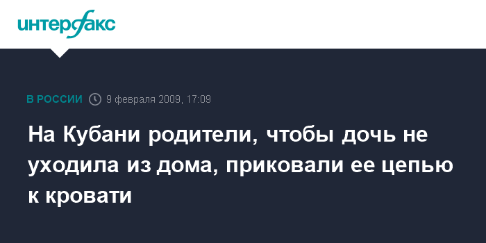 Москва. 9 февраля. INTERFAX.RU - Северский межрайонный следственный отдел СУ СКП РФ по Краснодарскому краю возбудил уголовное дело о незаконном лишении свободы 27-летней местной жительницы, которую родители почти полгода удерживали дома, приковав цепью к кровати.