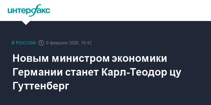Лондон. 9 февраля. INTERFAX.RU - Лидер партии "Христианско-социальный союз" (ХСС) Карл-Теодор цу Гуттенберг станет новым министром экономики Германии, сообщает в понедельник британская телерадиокорпорация BBC.
