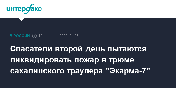 Южно-Сахалинск. 10 февраля. ИНТЕРФАКС-ДАЛЬНИЙ ВОСТОК - На траулере "Экарма-7" продолжаются работы по ликвидации пожара, сообщили агентству "Интерфакс-Дальний Восток" в службе наблюдения за флотом Невельского морского порта.