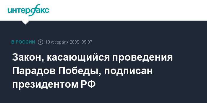 Как сообщалось, законом уточняются условия и места проведения военных парадов в ознаменование Дня Победы. Предусматривается проведение парадов по этому поводу в Москве, городах-героях, а также в городах, где дислоцированы штабы военных округов, флотов, общевойсковых армий и Каспийской флотилии.
