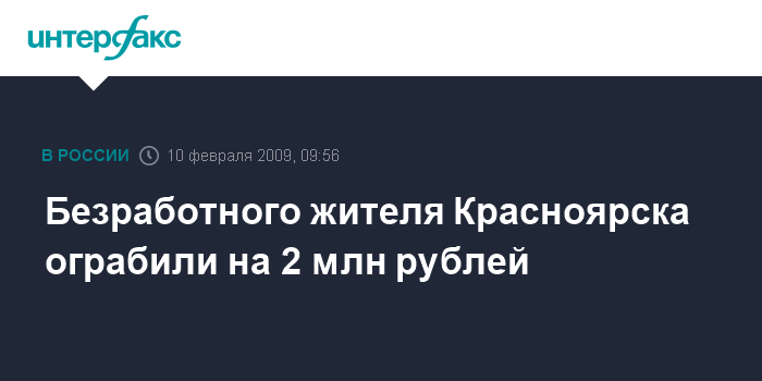 Москва. 10 февраля. INTERFAX.RU - В Красноярске неизвестные на улице отняли у местного жителя портфель с 2 млн рублей, сообщил "Интерфаксу" во вторник источник в правоохранительных органах.