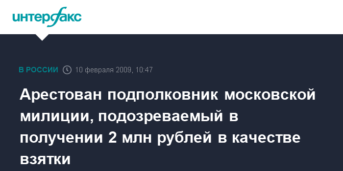 Арестован подполковник московской милиции, подозреваемый в получении 2 млн рублей в качестве взятки