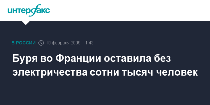 Москва. 10 февраля. INTERFAX.RU - Около 500 тыс. домохозяйств на западе и в центральной части Франции остались без электричества из-за бури, обрушившейся в ночь на вторник на эти районы. Отключения произошли из-за обрывов линий электропередач.