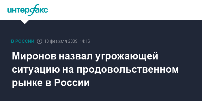 Москва. 10 февраля. INTERFAX.RU – Ситуация на продовольственном рынке России становится все более угрожающей, заявил спикер Совета Федерации Сергей Миронов "Интерфаксу" во вторник.