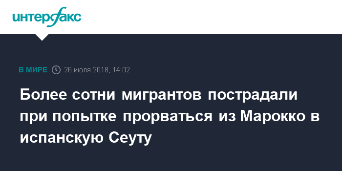 Москва. 26 июля. INTERFAX.RU - Почти 600 мигрантов в четверг попытались проникнуть в испанский анклав Сеуту с территории Марокко, сообщает Испанский Красный крест.
