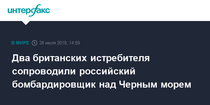 Москва. 26 июля. INTERFAX.RU - Королевские военно-воздушные силы Великобритании в четверг сообщили о том, что два британских истребителя "Тайфун", дислоцированные в Румынии, сопроводили над Черным морем российский бомбардировщик, приблизившийся к границам НАТО.