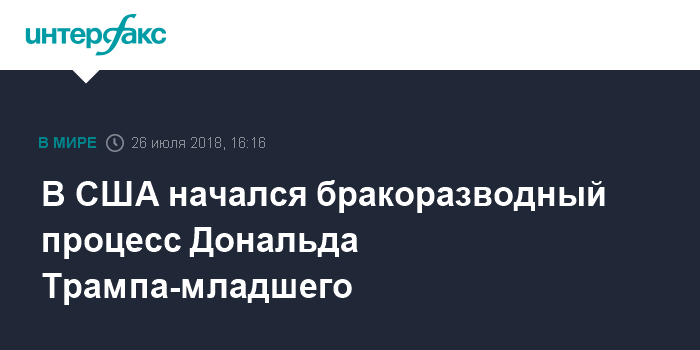 Москва. 26 июля. INTERFAX.RU - Старший сын президента США Дональд Трамп-младший и его супруга Ванесса Трамп прибыли в суд Манхеттена для начала бракоразводных слушаний, передает в четверг агентство Associated Press.