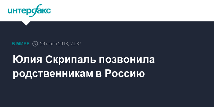 Москва. 26 июля. INTERFAX.RU - Родственница Скрипалей Виктория заявила, что пострадавший от отравления бывший офицер ГРУ Сергей Скрипаль пообещал позвонить матери, когда снимут трахеостому, то есть трубку, помещаемую в трахею.