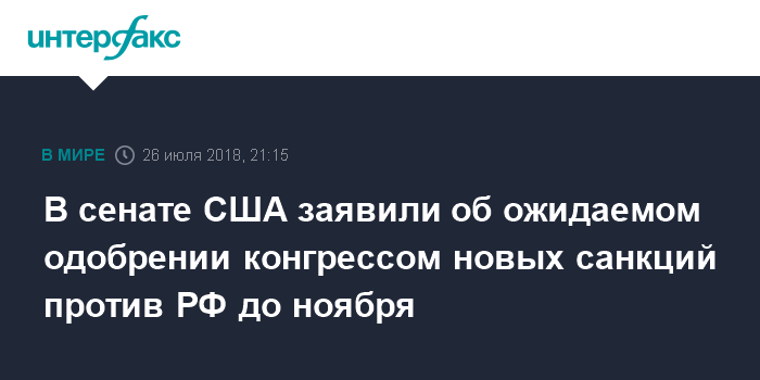 Москва. 26 июля. INTERFAX.RU - Американские конгрессмены, как ожидается, одобрят новый пакет санкций против России до запланированных на ноябрь промежуточных выборов в США, заявил в четверг глава сенатского комитета по международным делам Боб Коркер.