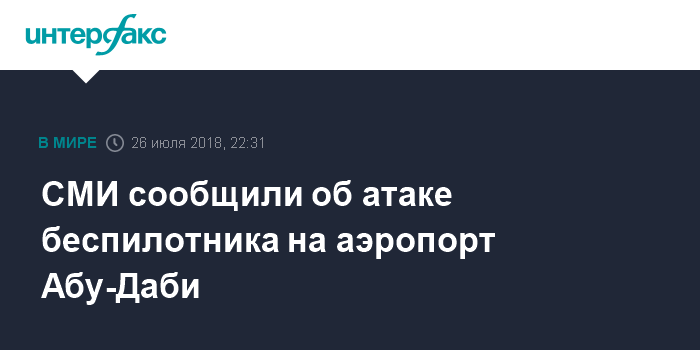 Москва. 26 июля. INTERFAX.RU - Йеменские мятежники-хуситы нанесли удар по международному аэропорту Абу-Даби (ОАЭ) с помощью беспилотника, сообщает в четверг межарабский телеканал Al Arabiya со ссылкой на контролируемые хуситами СМИ.