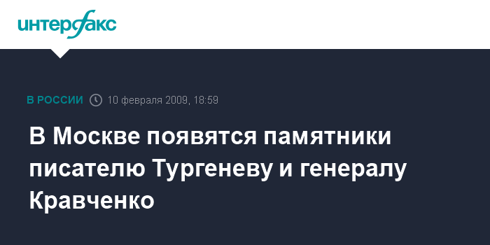 Москва. 10 февраля. INTERFAX.RU - В ближайшее время в Москве будут установлены памятники писателю Ивану Тургеневу, генералу-танкисту, герою Великой Отечественной войны Андрею Кравченко и советским интербригадовцам, сражавшимся во время Гражданской войны в Испании, решила комиссия по монументальному искусству при Мосгордуме.