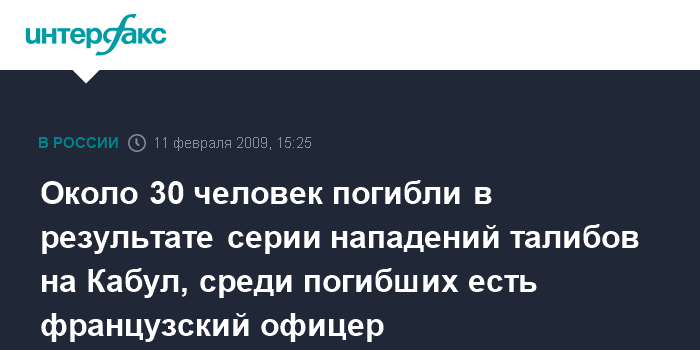 Москва. 11 февраля. INTERFAX.RU - Среди погибших в среду в результате серии терактов в Кабуле - один французский офицер, сообщило в коммюнике министерство обороны Франции.