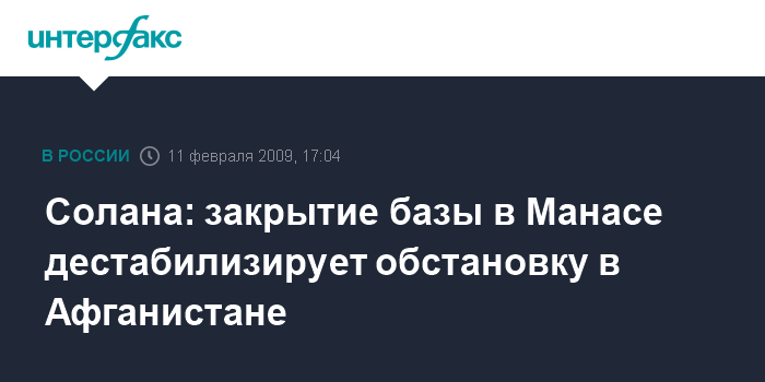 Солана добавил, что закрытие базы в Манасе "является дестабилизирующим фактором в Афганистане".
