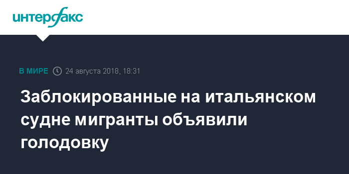 Москва. 24 августа. INTERFAX.RU - Находящиеся на борту судна Diciotti у итальянских берегов иммигранты объявили о голодовке. Об этом сообщил в пятницу замглавы Минздрава Италии Давиде Фараоне.