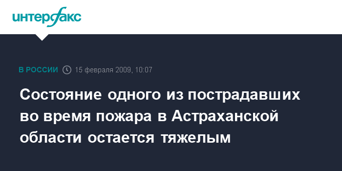 Астрахань. 15 февраля. INTERFAX.RU - Из семи пострадавших во время пожара в трехэтажном жилом доме в поселке Молодежный (Астраханская область) состояние одного остается тяжелым, сообщил агентству "Интерфакс-Юг" в воскресенье министр здравоохранения Астраханской области Виктор Акишкин.