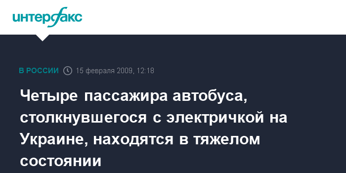 Киев. 15 февраля. INTERFAX.RU - Четыре из четырнадцати пострадавших пассажиров автобуса, который накануне столкнулся с электричкой в Тернопольской области, находятся в тяжелом состоянии.