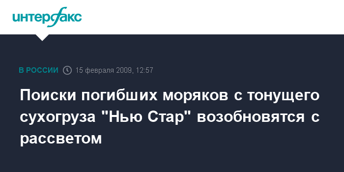 Владивосток. 15 февраля. INTERFAX.RU - В Японском море спасатели приостановили поиски тел погибших моряков с тонущего сухогруза "Нью Стар" (флаг Сьерра-Леоне).