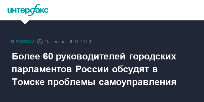 Томск. 15 февраля. INTERFAX.RU - В Томске 19-20 февраля пройдет собрание союза представительных органов местного самоуправления муниципальных образований РФ, в котором примут участие более 60 глав городских парламентов.