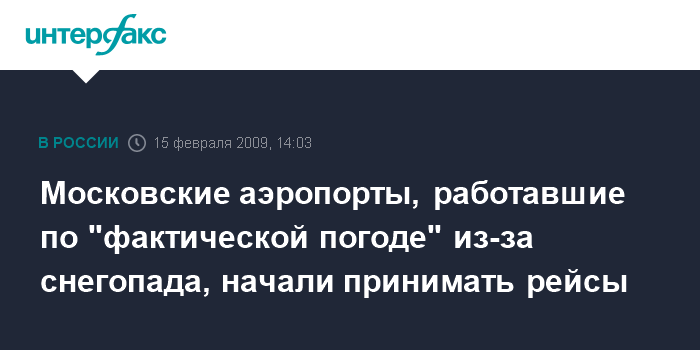 Москва. 15 февраля. INTERFAX.RU - Московские аэропорты в воскресенье из-за сильного снегопада были вынуждены перейти на режим работы "по фактической погоде", сообщил "Интерфаксу" дежурный центральной диспетчерской службы Московского авиаузла.