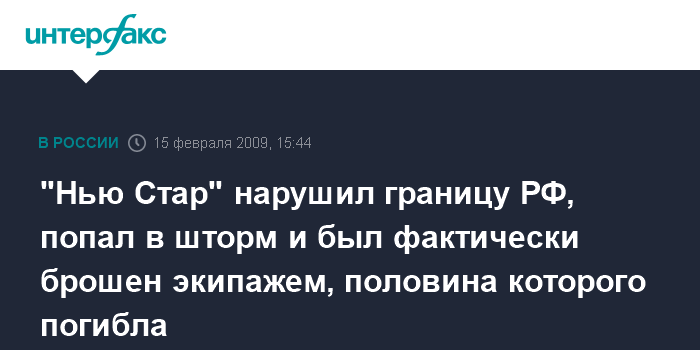 Владивосток. 15 февраля. INTERFAX.RU - Сухогруз "Нью Стар", половина экипажа которого погибла в штормовом море, покинул Находку без разрешения пограничных властей РФ и нарушил госграницу, заявила агентству "Интерфакс - Дальний Восток" руководитель пресс-группы Пограничного управления ФСБ России по Приморскому краю Наталья Рондалева.