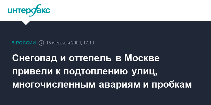 Москва. 15 февраля. INTERFAX.RU - Мокрый снег с дождем, идущий в столице практически без перерыва вторые сутки, привел к образованию большого числа подтоплений на улицах, передает корреспондент "Интерфакса".