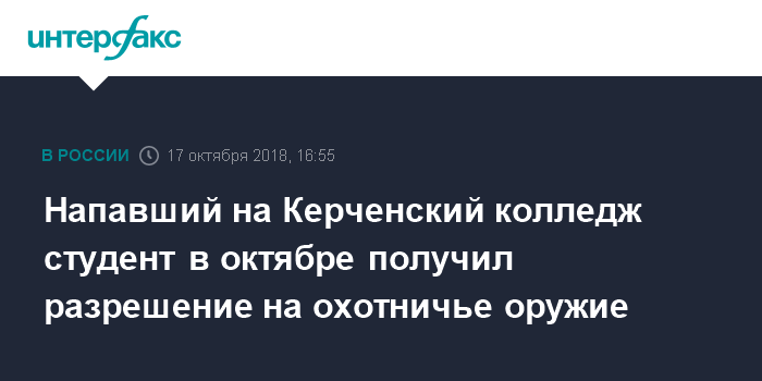 Москва. 17 октября. INTERFAX.RU - Студент, открывший стрельбу в Керченском колледже, в октябре получил разрешение на охотничье оружие, сообщила уполномоченный по защите прав ребенка в Крыму Ирина Клюева.