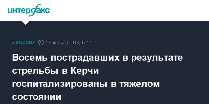 Москва. 17 октября. INTERFAX.RU - Восемь из 35 пострадавших в результате трагедии в керченском колледже находятся в тяжелом состоянии, сообщил глава Крыма Сергей Аксенов.