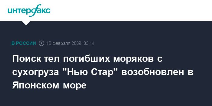 Владивосток. 16 февраля. ИНТЕРФАКС-ДАЛЬНИЙ ВОСТОК - В Японском море спасатели возобновили поиски тел погибших моряков с тонущего сухогруза "Нью Стар" (флаг Сьерра-Леоне).