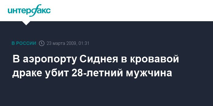 Москва. 23 марта. ИНТЕРФАКС - Во внезапно вспыхнувшей драке в зоне прилета внутренних авиалиний аэропорта Сиднея (Австралия) в воскресенье погиб 28-летний мужчина.