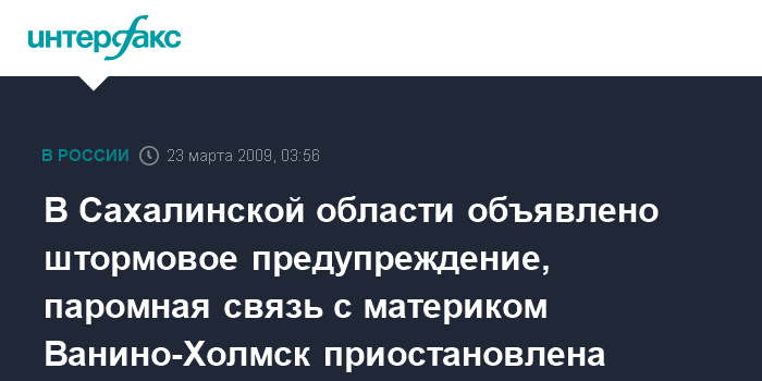Южно-Сахалинск. 23 марта. ИНТЕРФАКС - ДАЛЬНИЙ ВОСТОК - В Сахалинской области объявлено штормовое предупреждение в связи с подходом двух циклонов, сообщили агентству "Интерфакс - Дальний Восток" в пресс-службе ГУ МЧС по Сахалинской области.