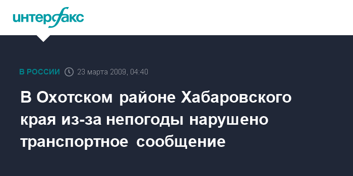 Хабаровск. 23 марта. ИНТЕРФАКС - ДАЛЬНИЙ ВОСТОК - В Хабаровском крае снегопады и сильный ветер стали причиной нарушения транспортного сообщения в Охотском районе, сообщили агентству "Интерфакс - Дальний Восток" в пресс-службе регионального управления МЧС РФ в понедельник.