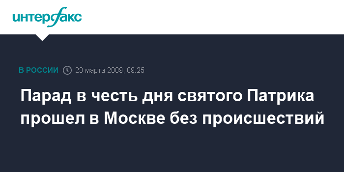 Москва. 23 марта. INTERFAX.RU - В российской столице парад в честь дня святого Патрика прошел без происшествий, сообщили "Интерфаксу" в управлении информации и общественных связей ГУВД Москвы.