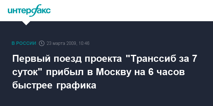 Москва. 23 марта. INTERFAX.RU - Первый ускоренный контейнерный поезд со станции Находка- Восточная прибыл 22 марта в 4:30 на станцию Москва- Товарная Октябрьская на 6 часов быстрее установленного графика.