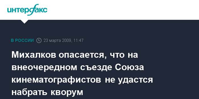 Москва. 23 марта. INTERFAX.RU - Существует опасность, что на внеочередном съезде Союза кинематографистов 30-31 марта не будет кворума, что ставит под угрозу существование организации, заявил организатор съезда, кинорежиссер Никита Михалков.