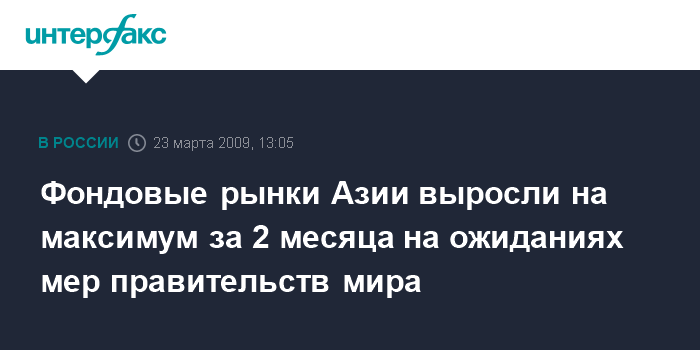 Москва. 23 марта. INTERFAX.RU - Темпы роста азиатских фондовых индексов были в понедельник самыми быстрыми за 2 месяца на фоне оптимизма, связанного с мерами правительств по всему миру, направленными на стимулирование экономики, сообщает агентство Bloomberg.