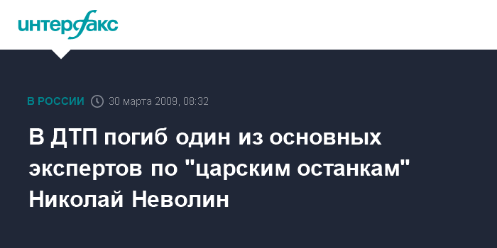 Обстоятельства и точные причины ДТП выясняются, добавил он. Неволин в числе других специалистов более 15 лет проводил экспертизу останков, найденных на Старой Коптяковской дороге близ Екатеринбурга. Эксперты пришли к выводу, что обнаруженные костные фрагменты принадлежат членам семьи последнего российского императора.