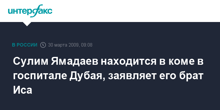 Москва. 30 марта. INTERFAX.RU - Сулим Ямадаев после покушения на него в Дубаи (ОАЭ) находится в госпитале в тяжелом состоянии, утверждает его брат Иса Ямадаев.