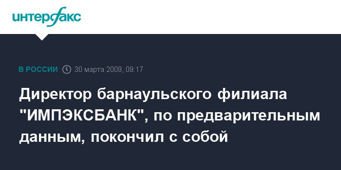 Директор барнаульского филиала "ИМПЭКСБАНК", по предварительным данным, покончил с собой