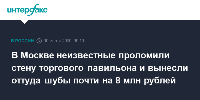 Москва. 30 марта. INTERFAX.RU - Неизвестные злоумышленники совершили кражу более 90 меховых шуб из торгового павильона, расположенного на территории столичного аэровокзала.