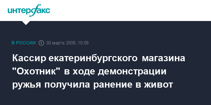 Москва. 30 марта. INTERFAX.RU - В екатеринбургском магазине "Охотник" продавец, демонстрируя ружье, тяжело ранил женщину-кассира.