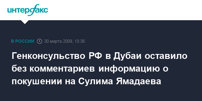 Москва. 30 марта. INTERFAX.RU - Российское генконсульство в Дубаи не комментирует сообщения о возможном покушении на Сулима Ямадаева в этом городе ОАЭ.