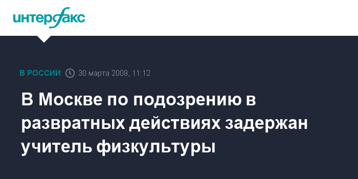 Москва. 30 марта. INTERFAX.RU - Задержан учитель физкультуры одной из московских школ, подозреваемый в развратных действиях в отношении ученика, сообщил "Интерфаксу" источник в правоохранительных органах города в понедельник.