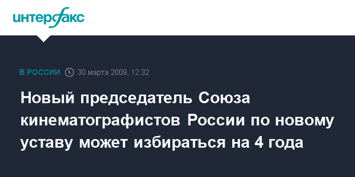 Москва. 30 марта. INTERFAX.RU - В проекте нового устава Союза кинематографистов, который будет рассматриваться на съезде организации в понедельник, предлагается увеличить срок полномочий председателя Союза до четырех лет.
